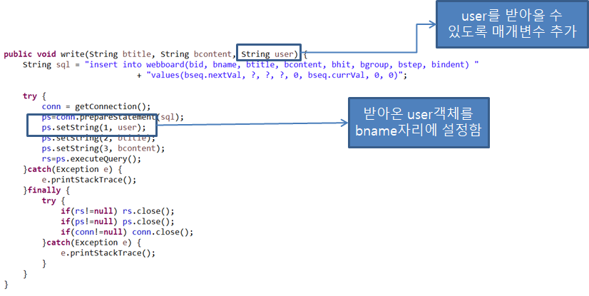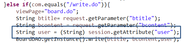 그리고 BoardServlet에 가서 write.do를 실행할 때 사용할 user세션을 얻어온뒤 함수 실행할때 매개변수로 사용하여 실행한다.