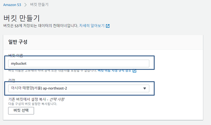 2-2 버킷 이름과 리전을 선택하고 나머지는 스킵한 뒤 버킷 만들기 클릭