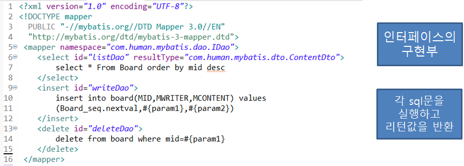 list 말고도 write나 delete도 IDao.xml에 비슷한 방식으로 추가하고, jsp파일을 만들어 구현하면 sql문이 작동되면서 실행된다.