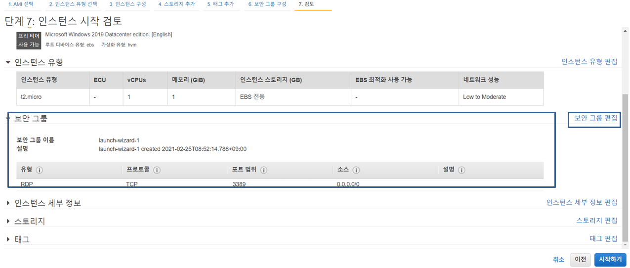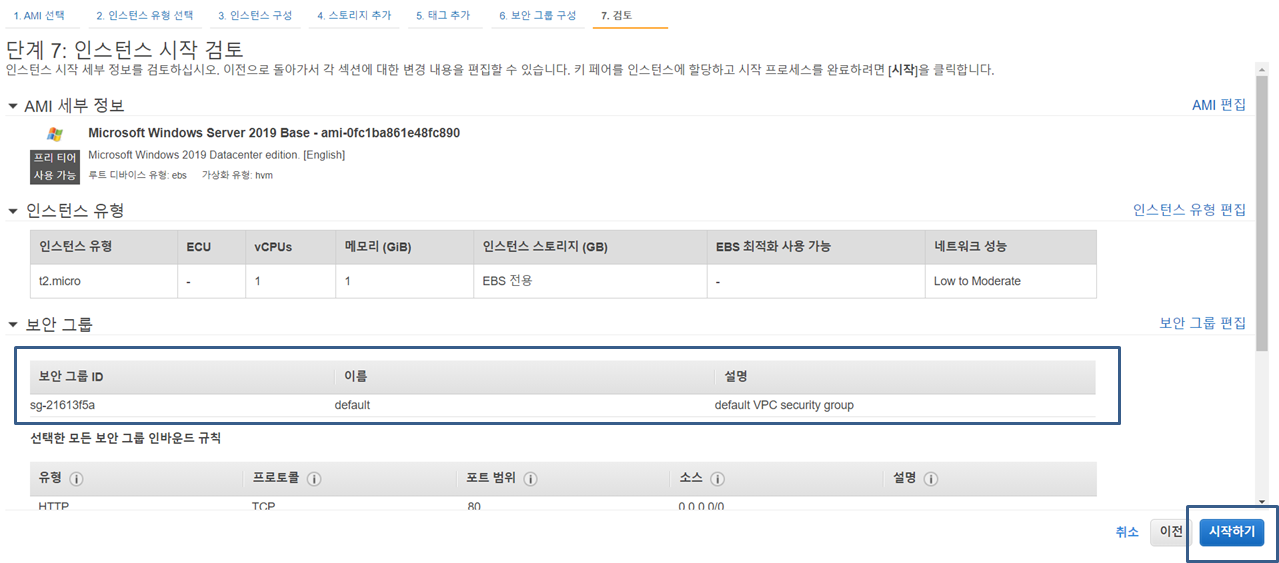 그러면 이제 보안그룹이 변경되었고 시작하기 클릭