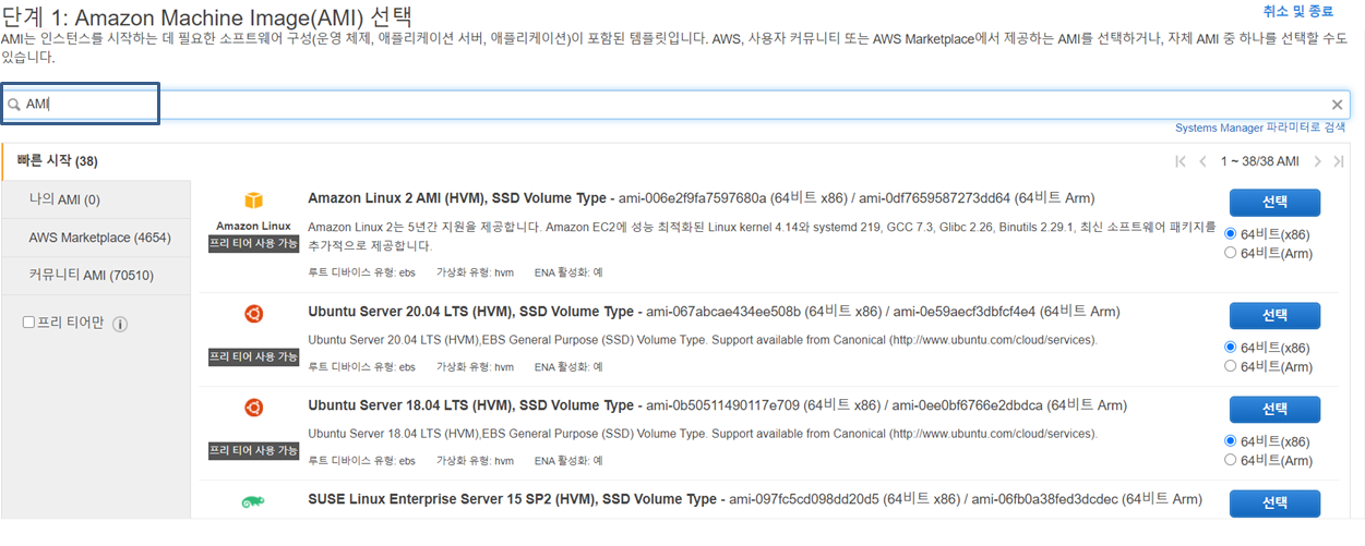 1. AMI선택 AMI검색하거나 아래로 스크롤해서