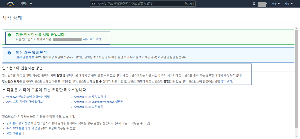 아래와 같이 시작중입니다...라고 뜸 aws에서 연결하는 방법을 알려주었으니 좀 기다렸다가 연결할 것이다.