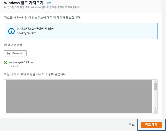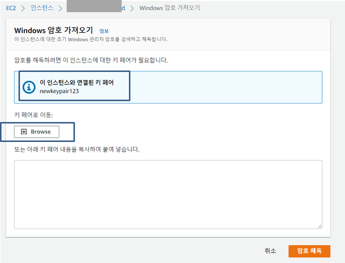 암호 가져오기 창에서는 이전에 만들었던 키페어를 사용한다. pem이나 ppk로 만든 그것을 browse 해서 경로를 찾아 추가해 준다.
