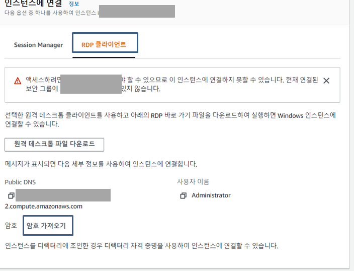 그러면 다음과 같은 창이 뜨는데 RDP클라이언트를 클릭한 다음 암호 가져오기 클릭.