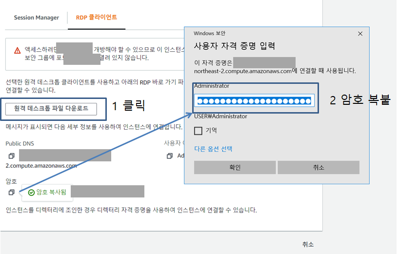 그러면 원격 데스크톱 파일 다운로드 클릭하고 암호 복사해서 붙여 넣는다.